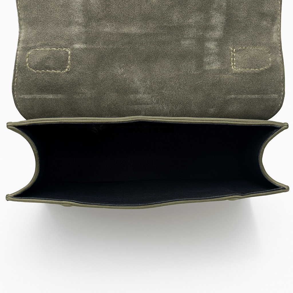 - A single unlined compartment with a side zip pocket.