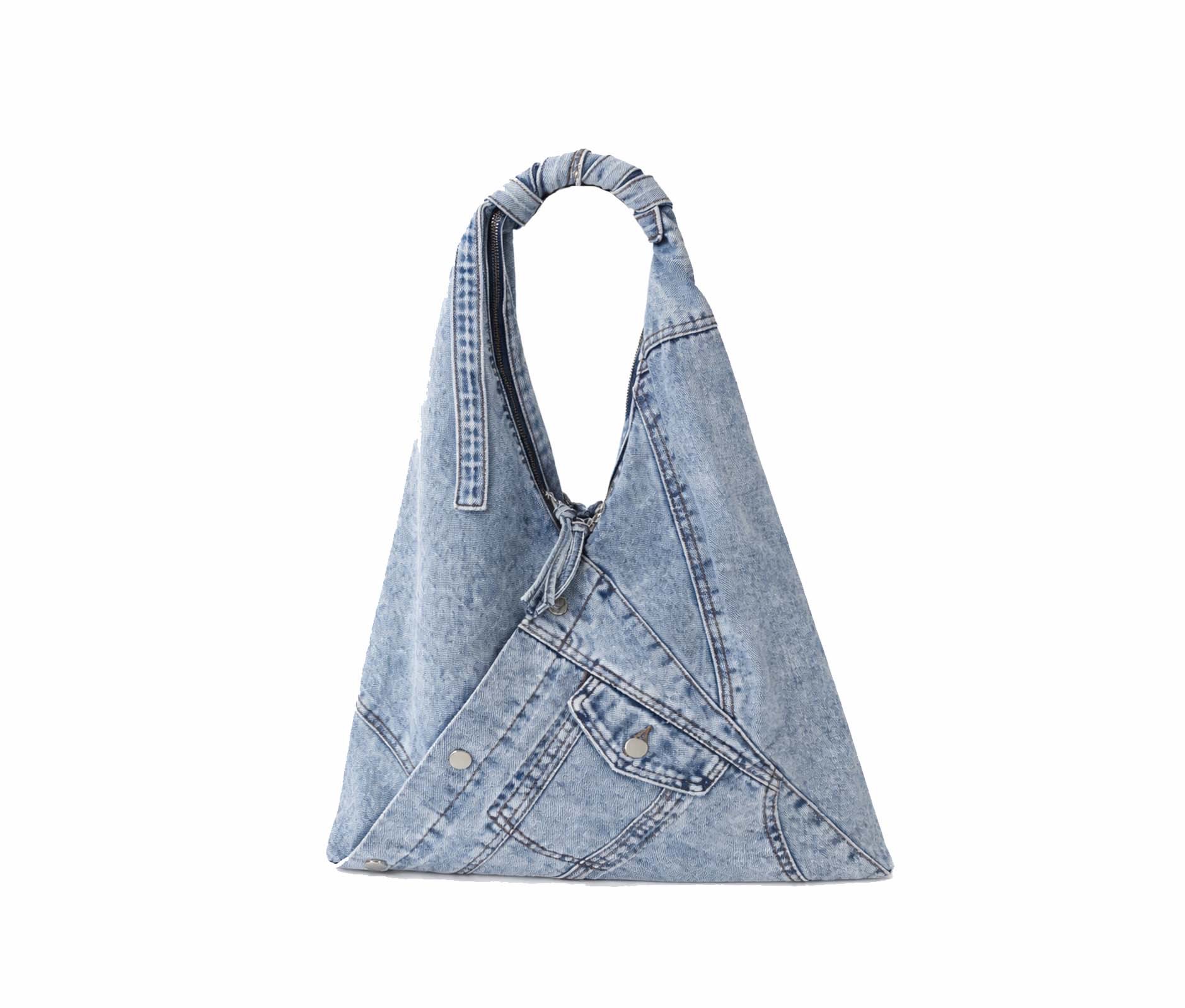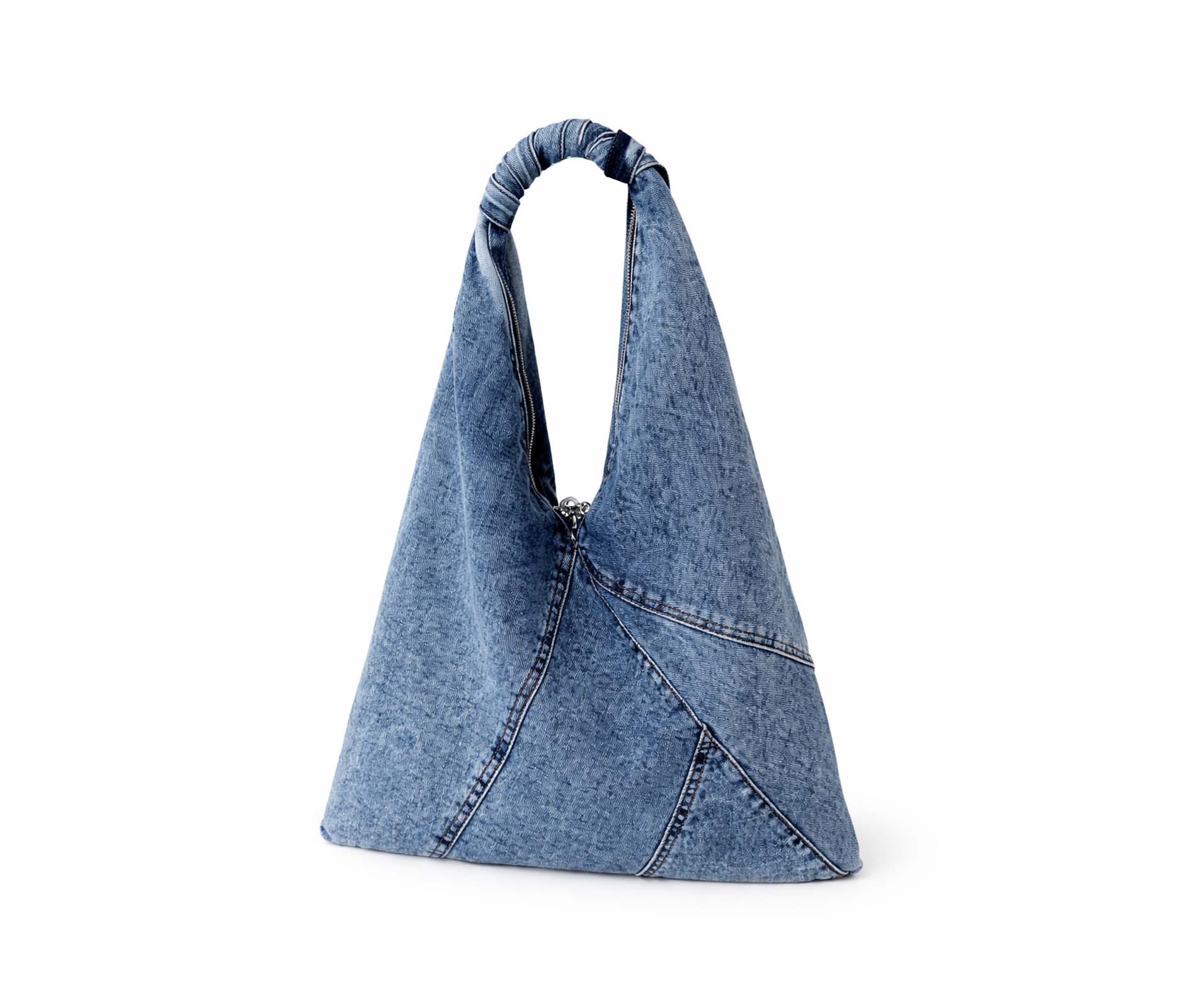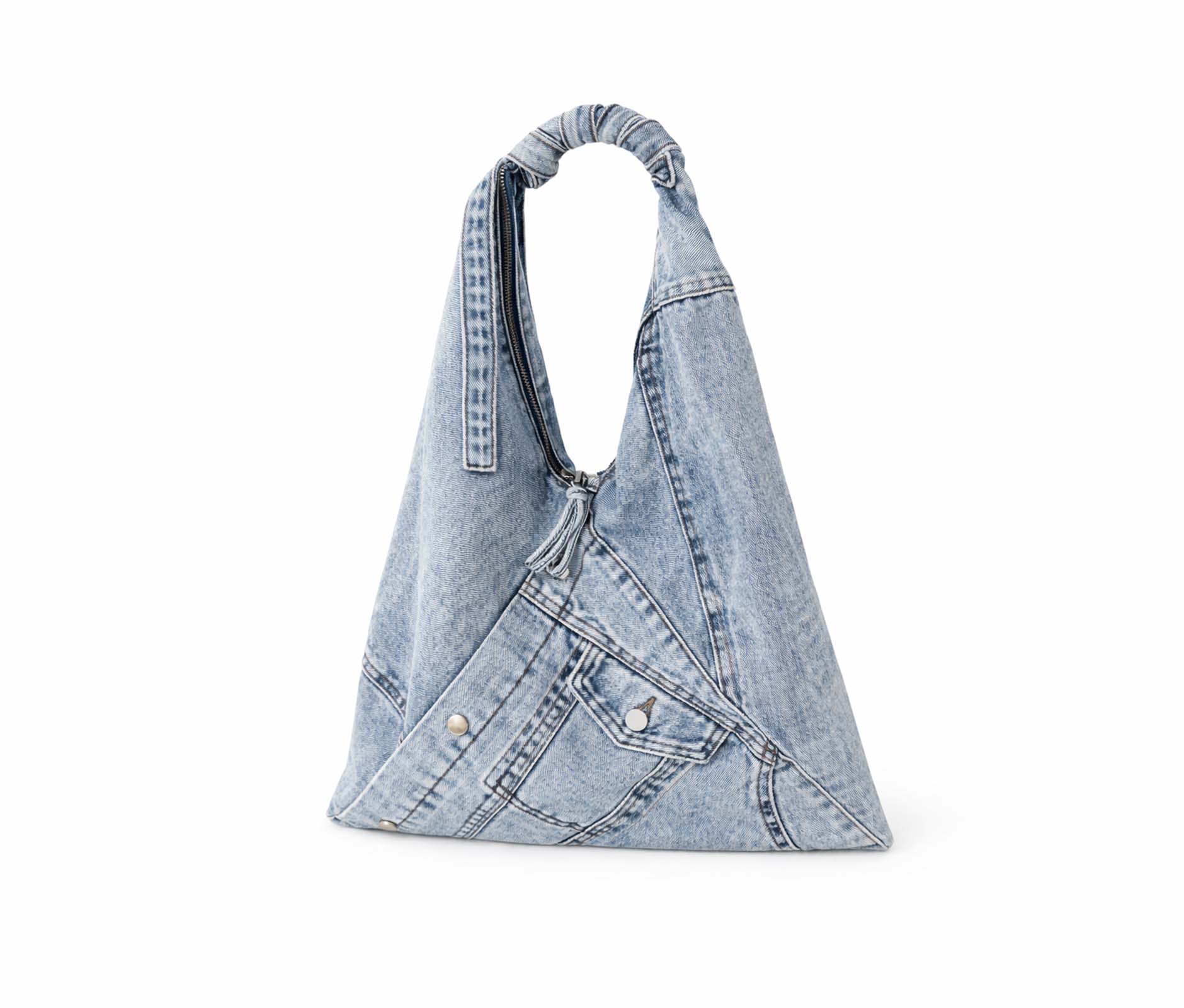 - Soft triangular shoulder bag in patchwork denim, washed blue jeans.