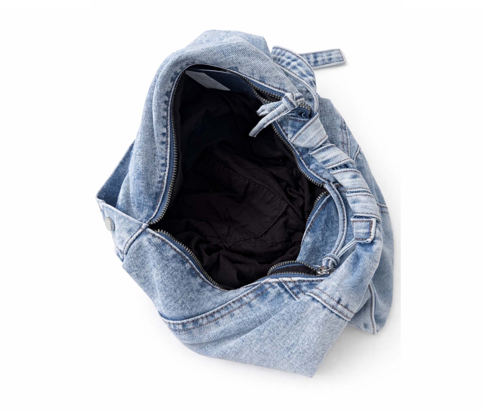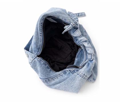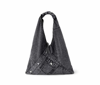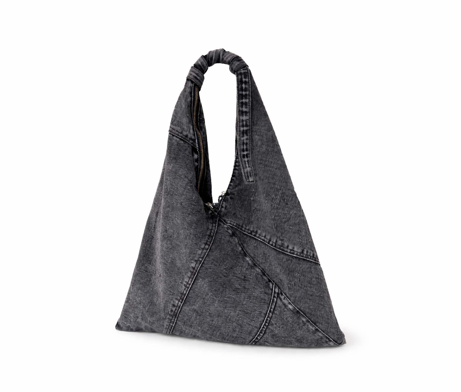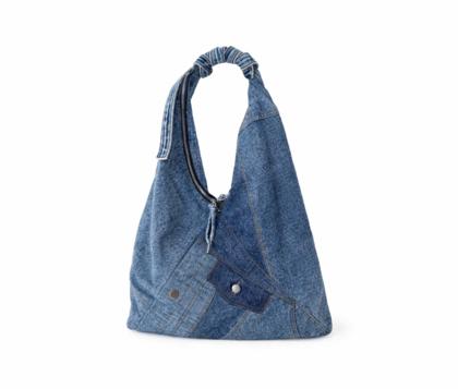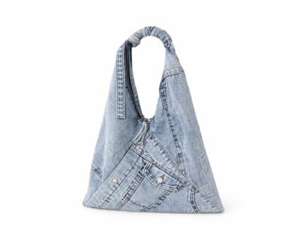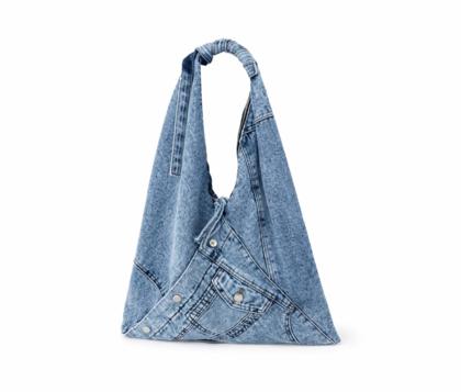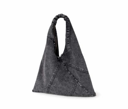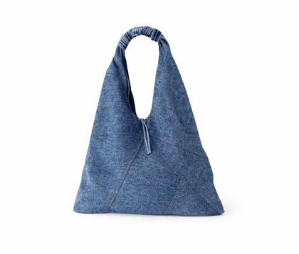 - Soft triangular shoulder bag in patchwork denim, washed blue jeans.