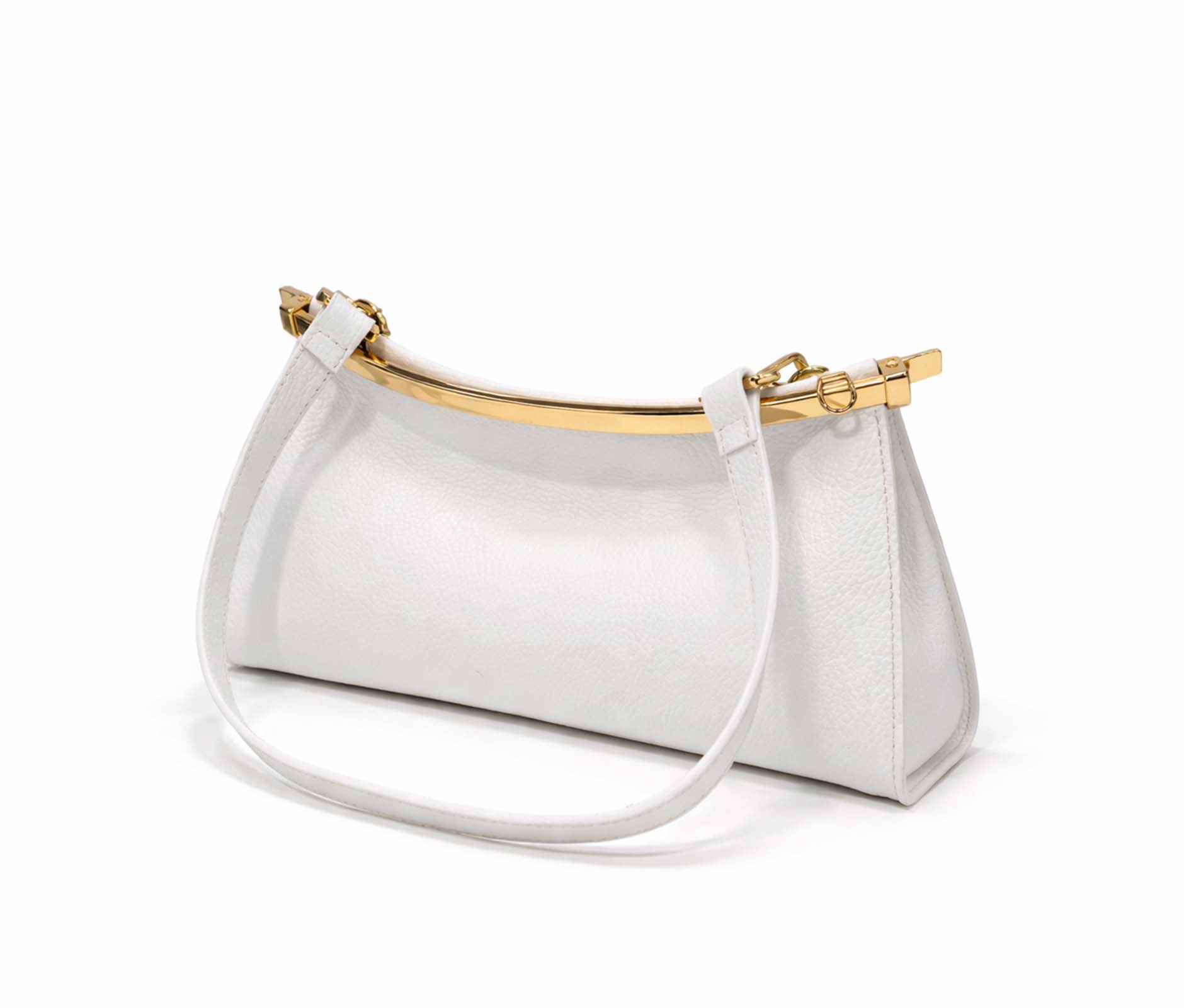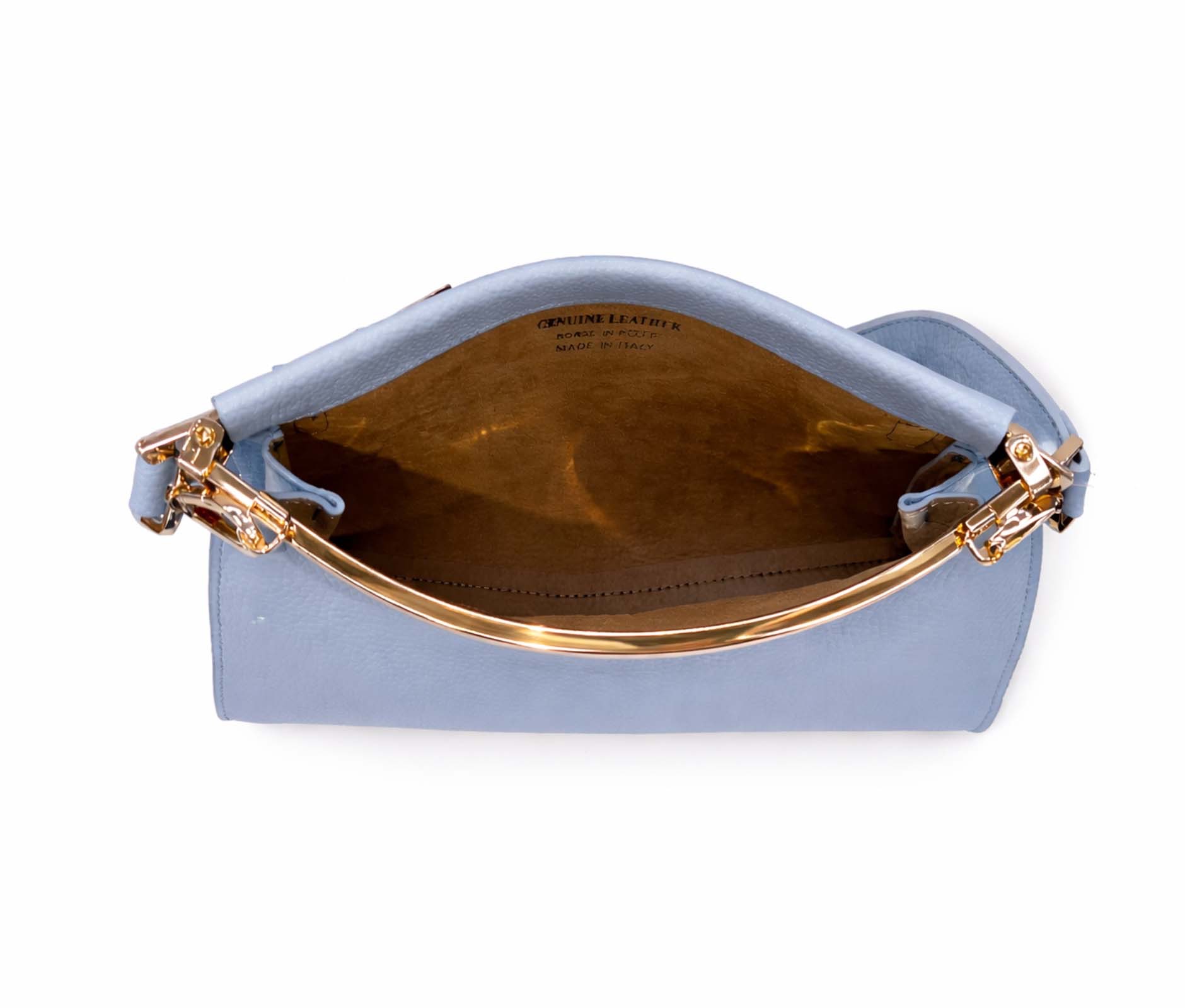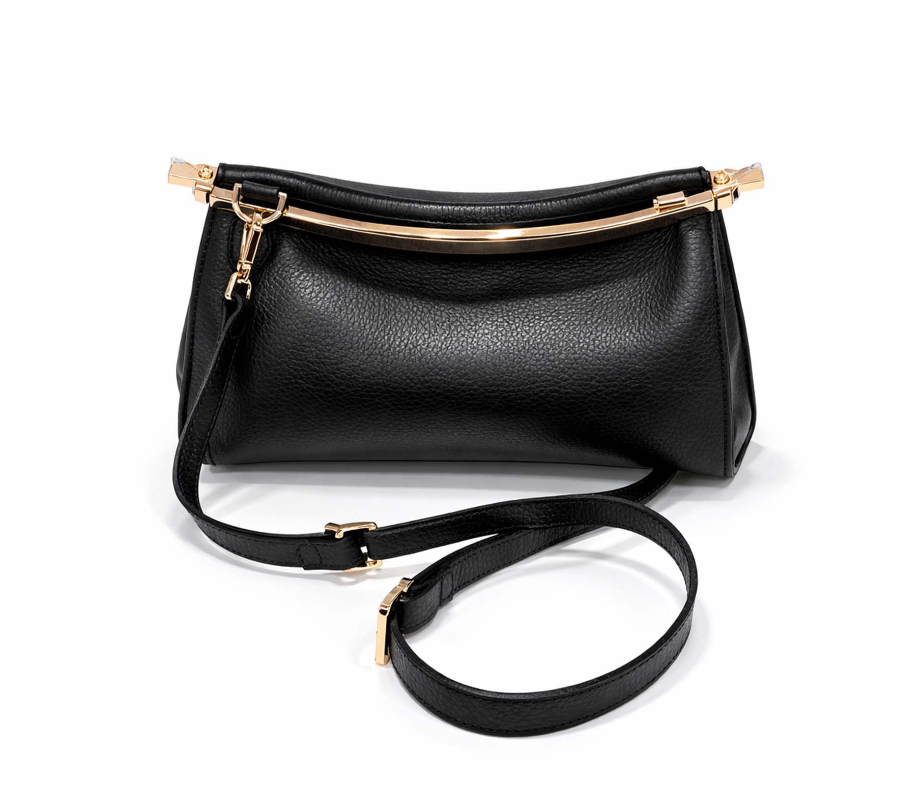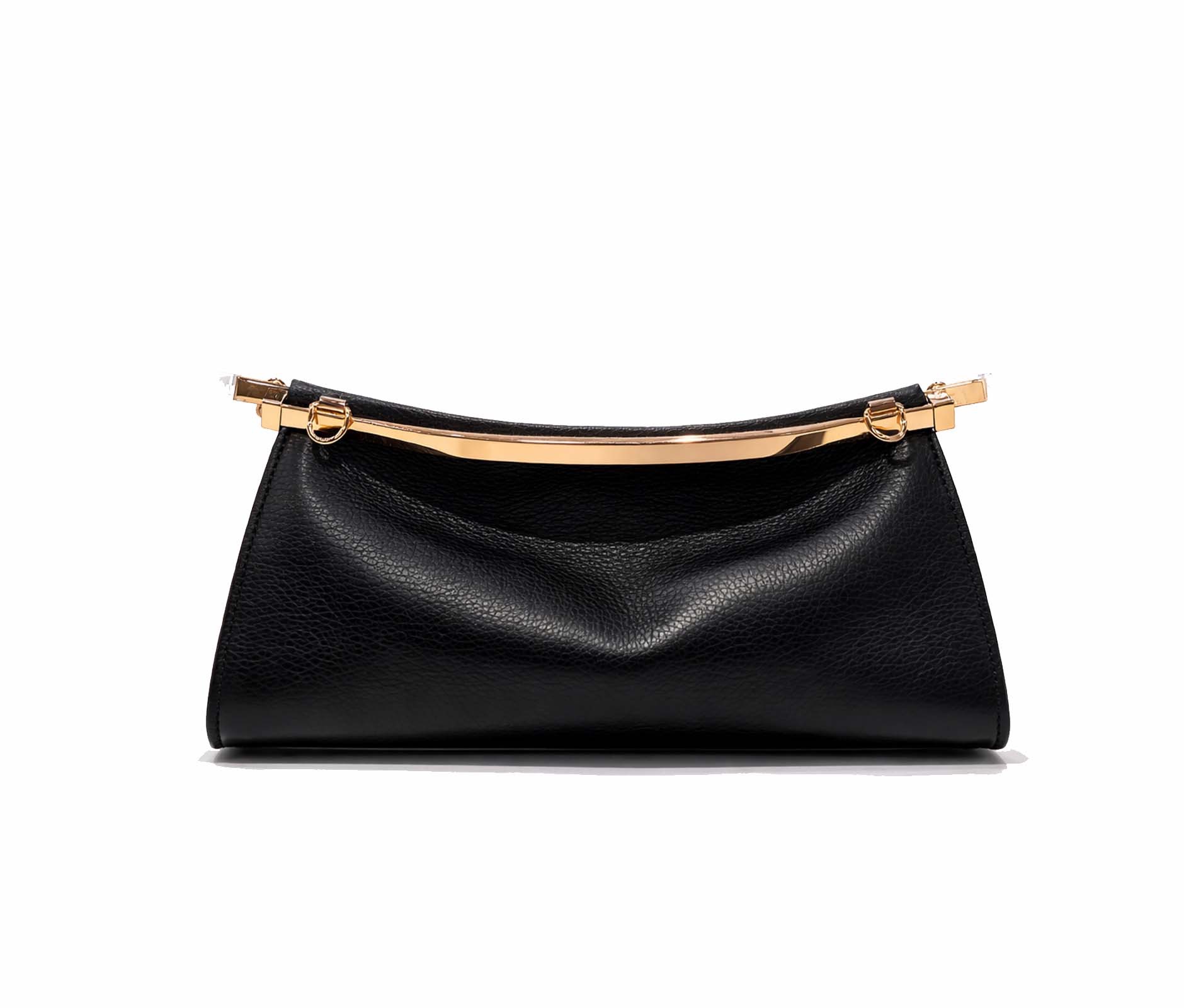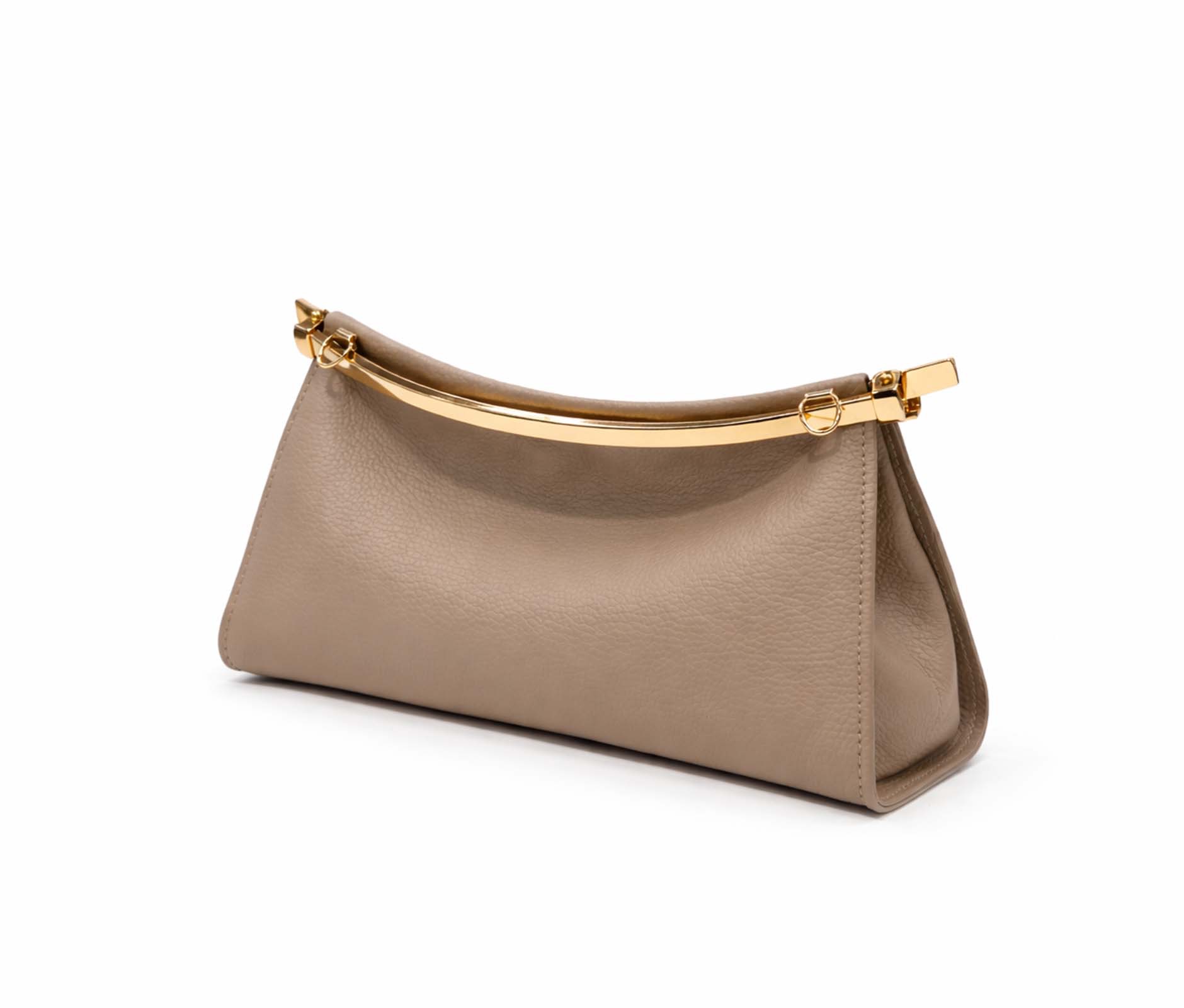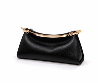 - Hammered leather and rigid top bar in shiny gold metal.