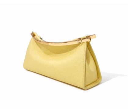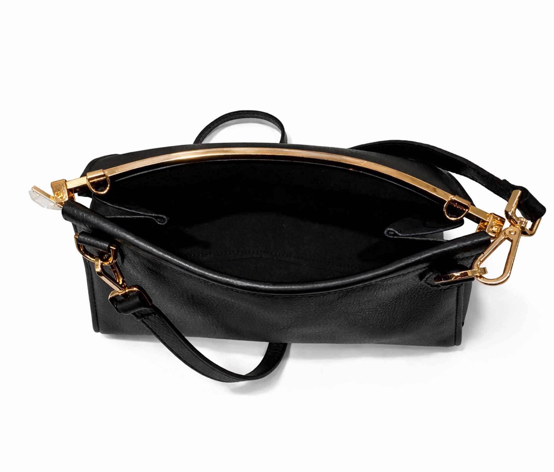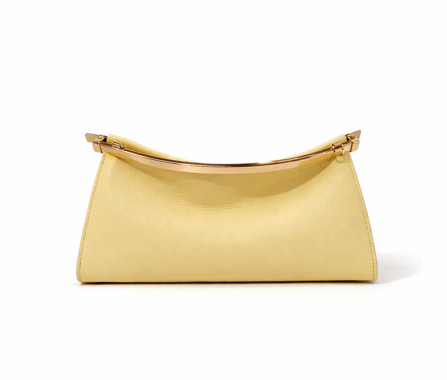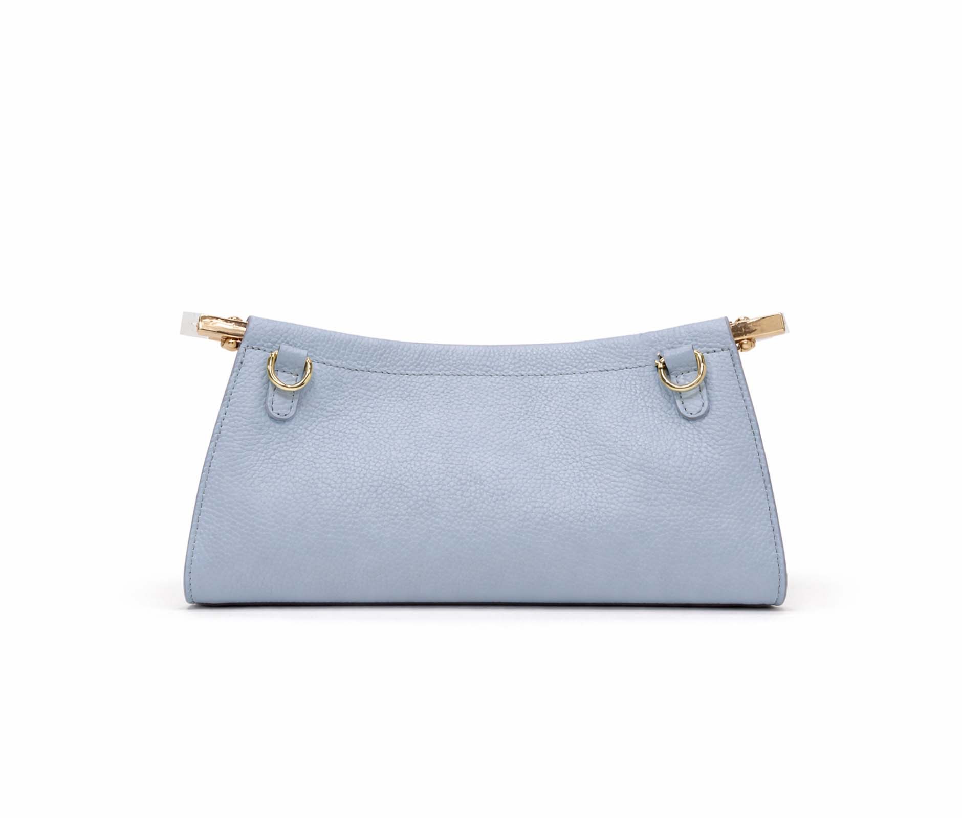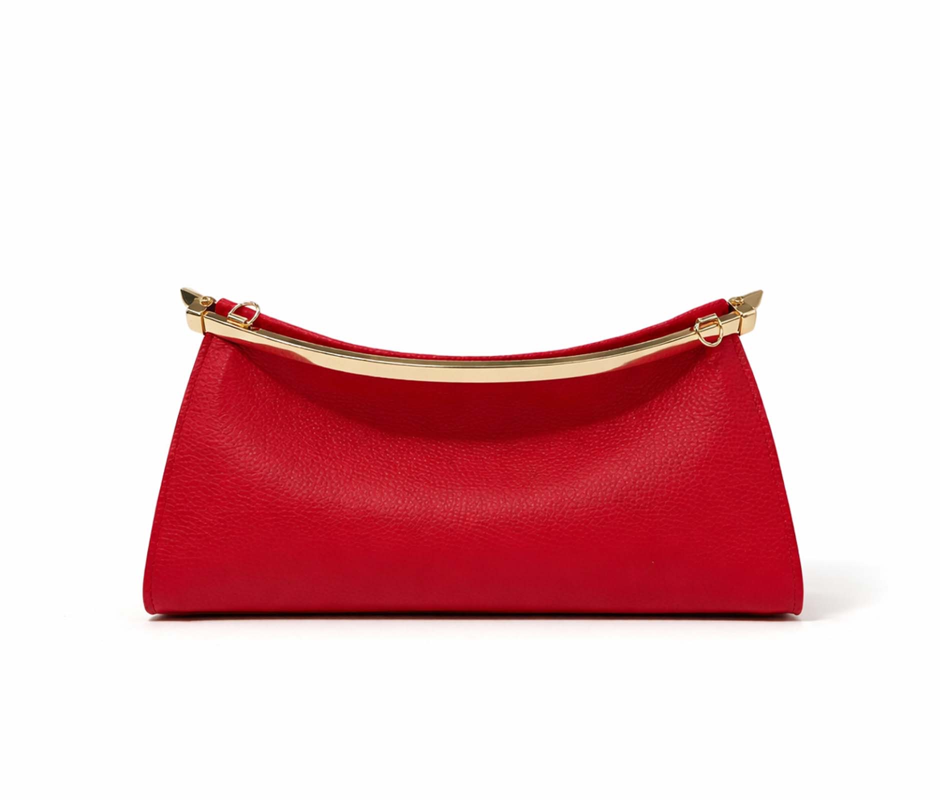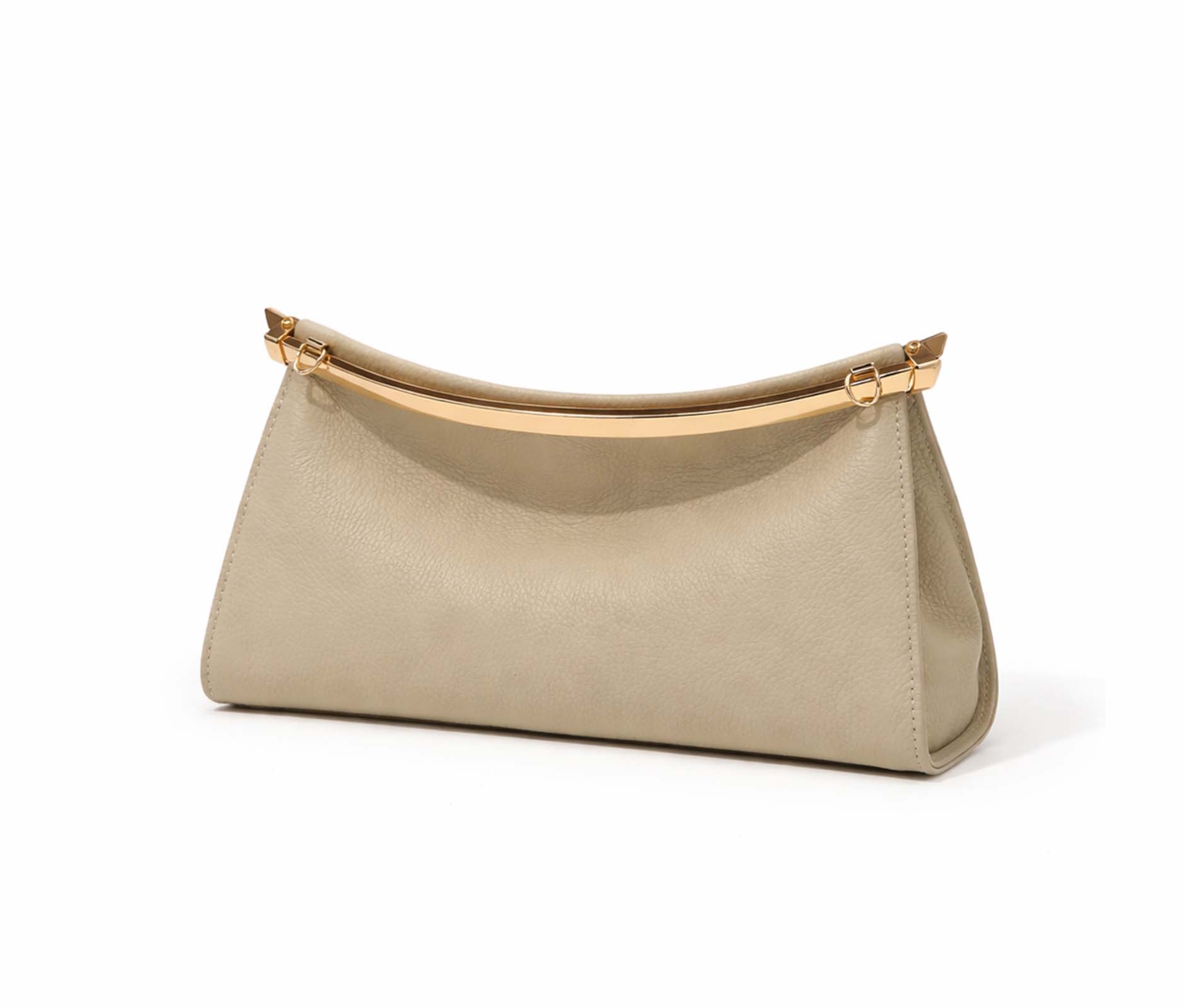 - Hammered leather and rigid top bar in shiny gold metal.