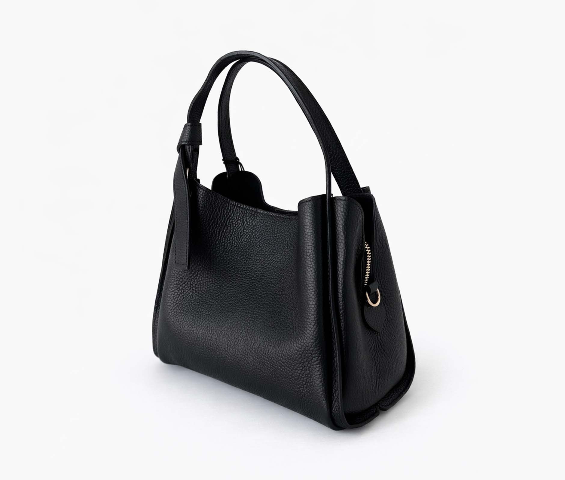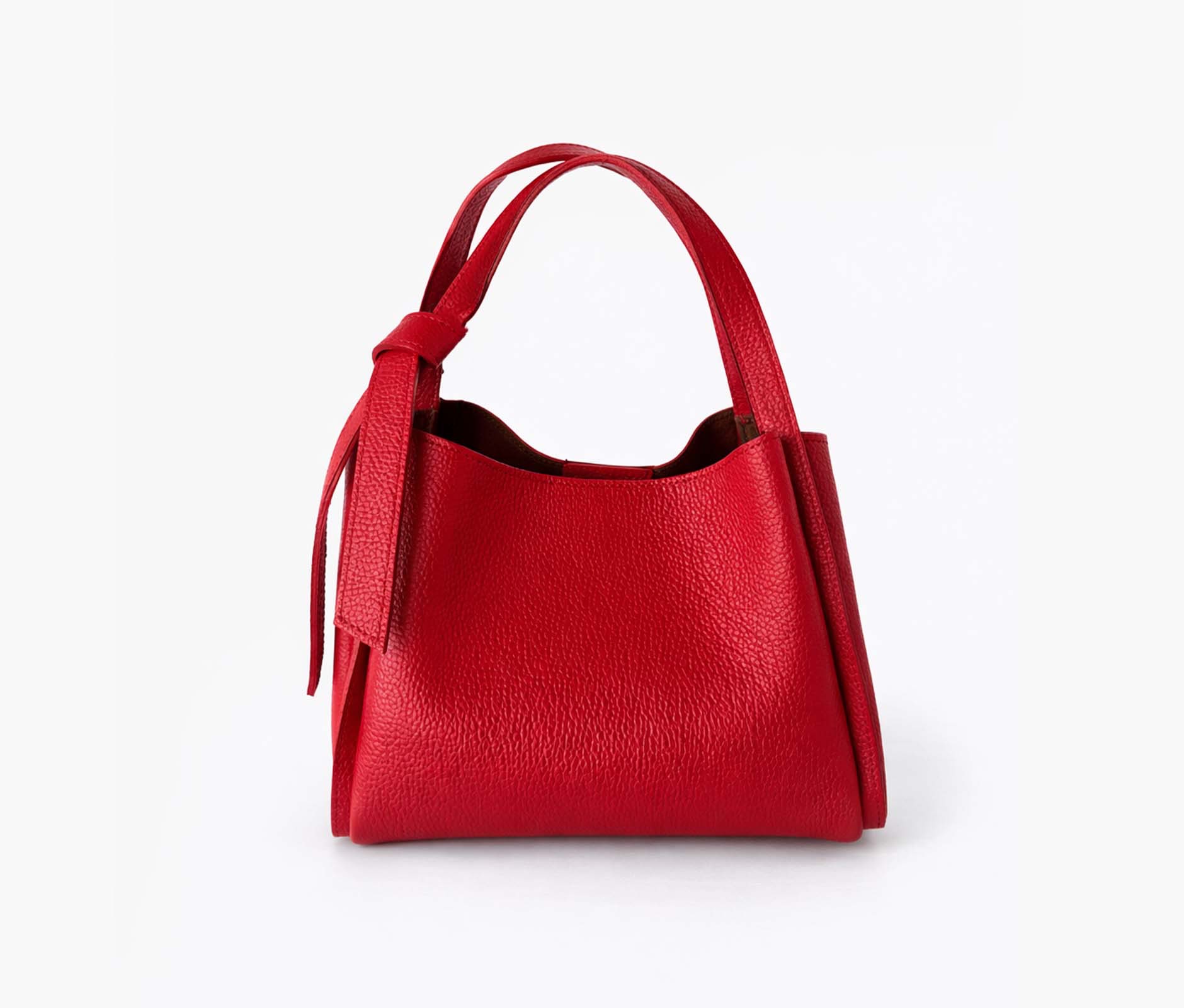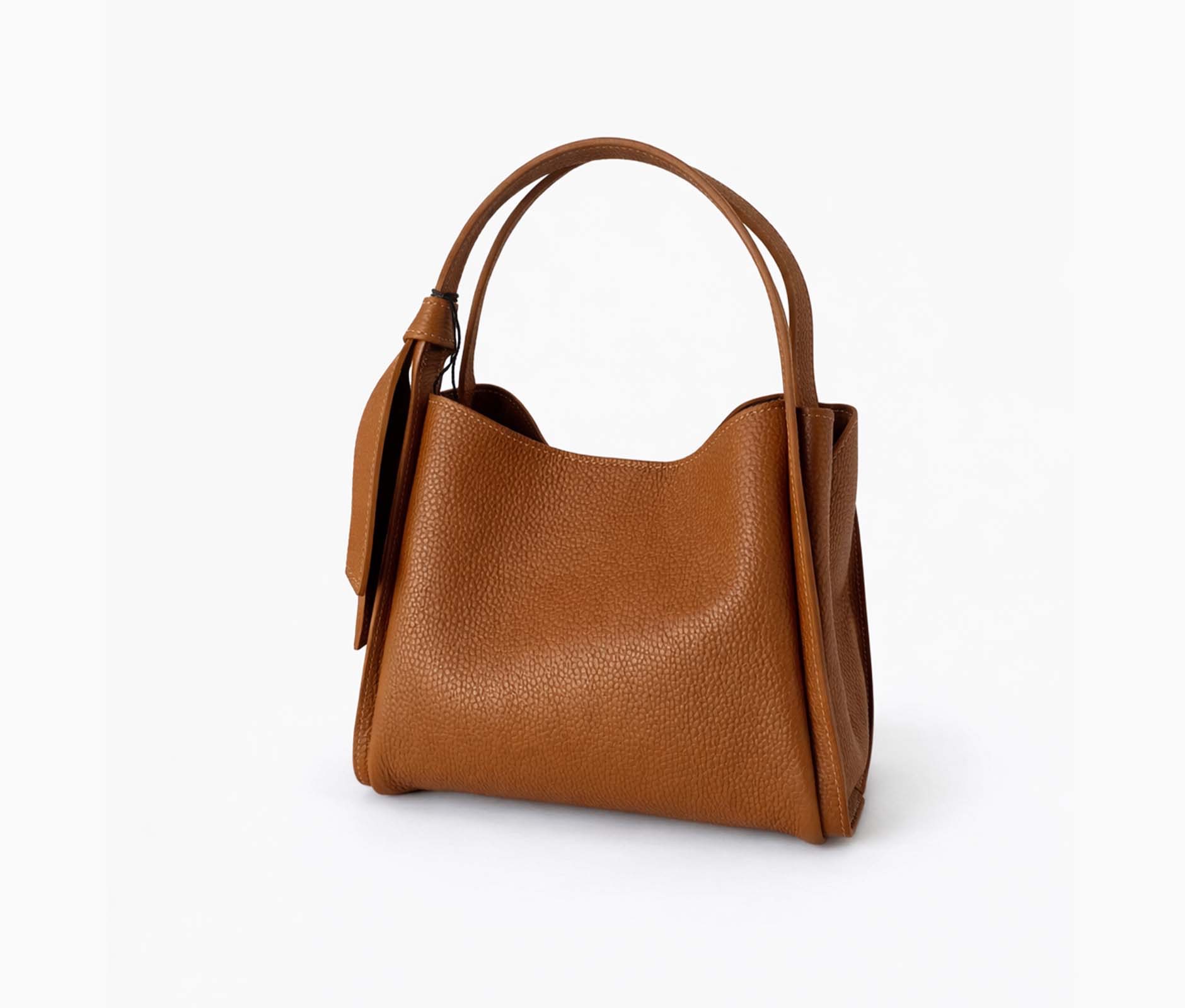 - Handbag with semi-rigid and compact trapezoid-shaped structure in hammered leather.
